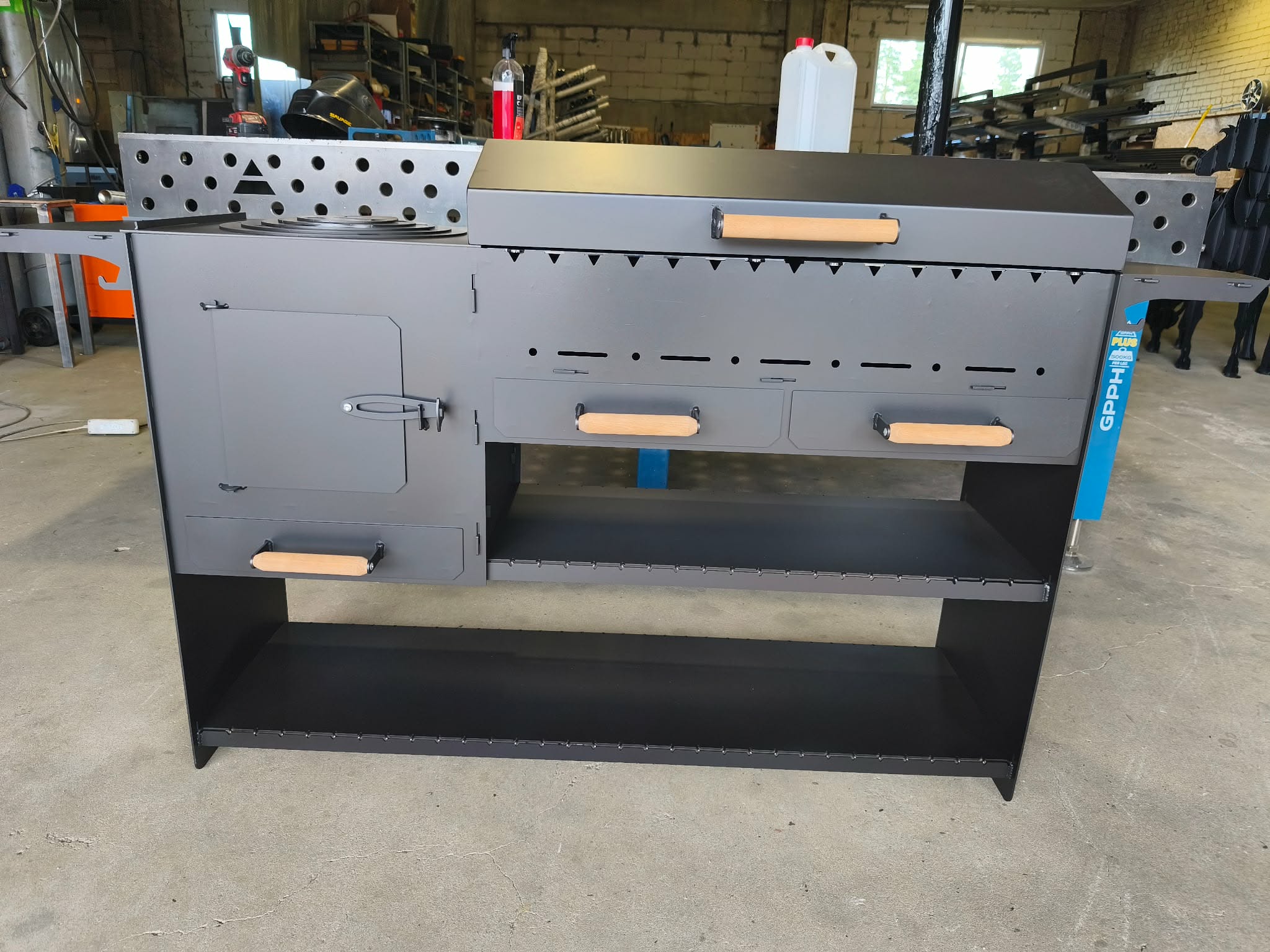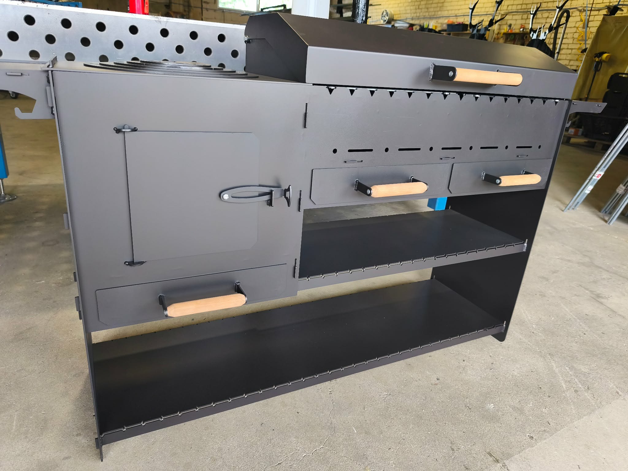 Praktiška konstrukcija ir aiškiai apgalvotos detalės leidžia patogiai ruošti maistą kieme, sodyboje ar renginių metu.